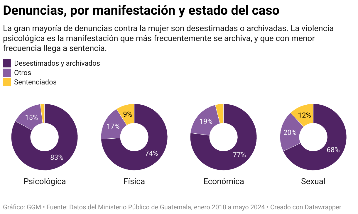 La gran mayoría de denuncias contra la mujer son desestimadas o archivadas. La violencia psicológica es la manifestación que más frecuentemente se archiva, y que con menor frecuencia llega a sentencia.